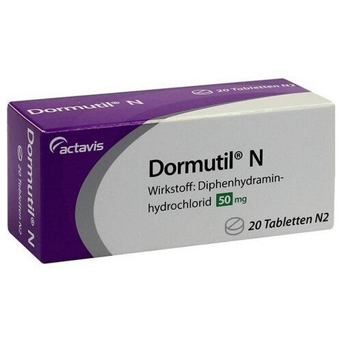 Dormutil N. Wirkstoff: Diphenhydraminhydrochlorid. Apothekenpflichtig. Anwendungsgebiete: Zur Behandlung von Einschlaf- und Durchschlafstörungen. Warnhinweis: Enthält Lactose. Stand der Information: März 2014. PUREN Pharma GmbH & Co. KG, Willy-Brandt-Allee 2, 81829 München.